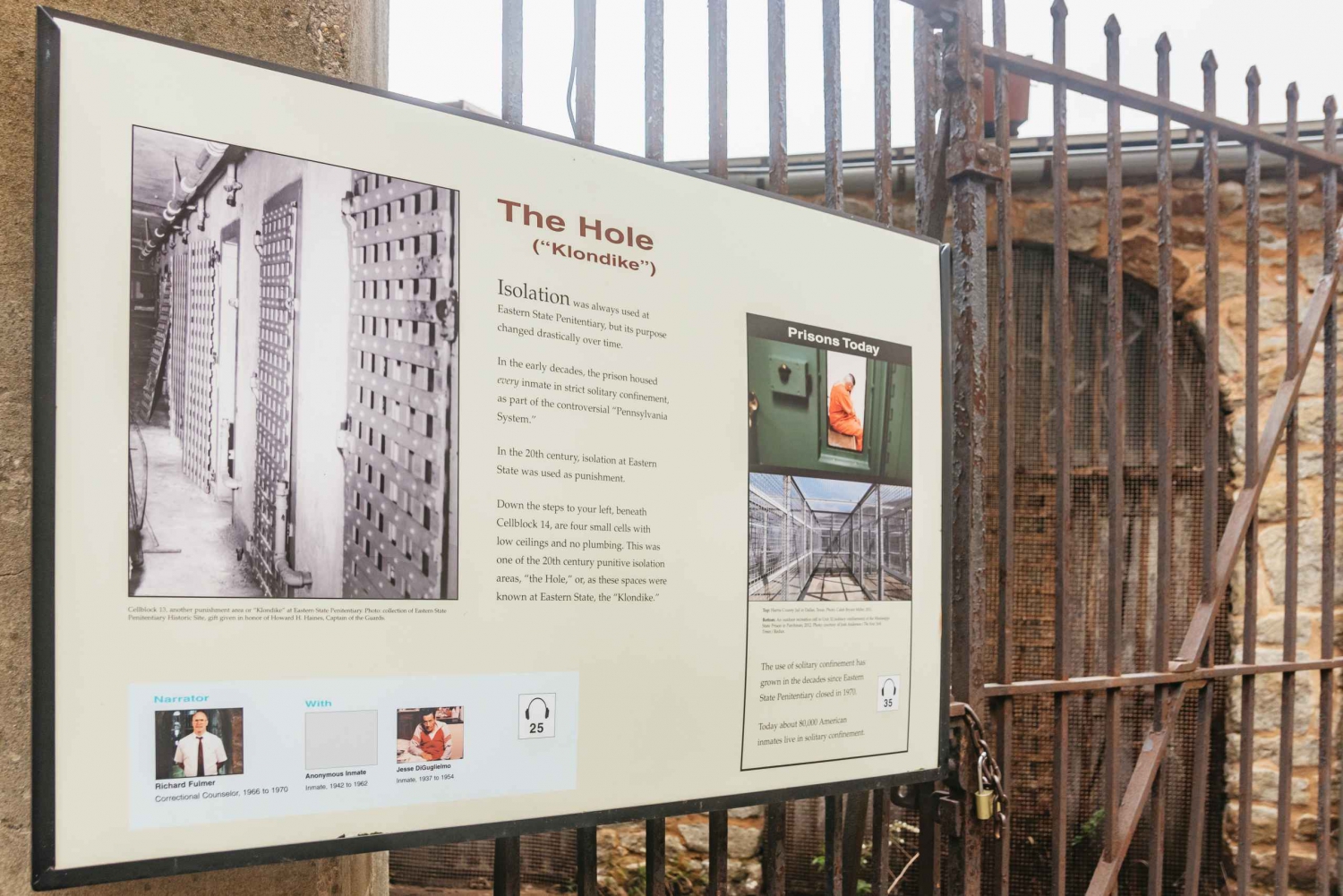 Mens du udforsker bygningen, kan du lytte til 'The Voices of Eastern State' lydtur, som er inkluderet i din entrépris. Fortalt af skuespilleren Steve Buscemi (kendt for Boardwalk Empire, Fargo, Armageddon og Ghost World), dette rige stereolydbillede blander snesevis af stemmer. Hør historierne om 3 tidligere vagter og 25 vagter og indsatte, som skaber en stemningsfuld tur, mens du slentrer gennem Øststatens celleblokke og gårdhaver.