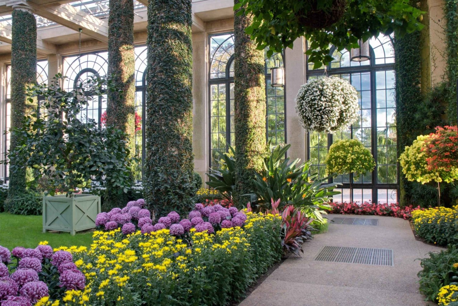 - See seasonal flower displays bursting with color inside a historic conservatory